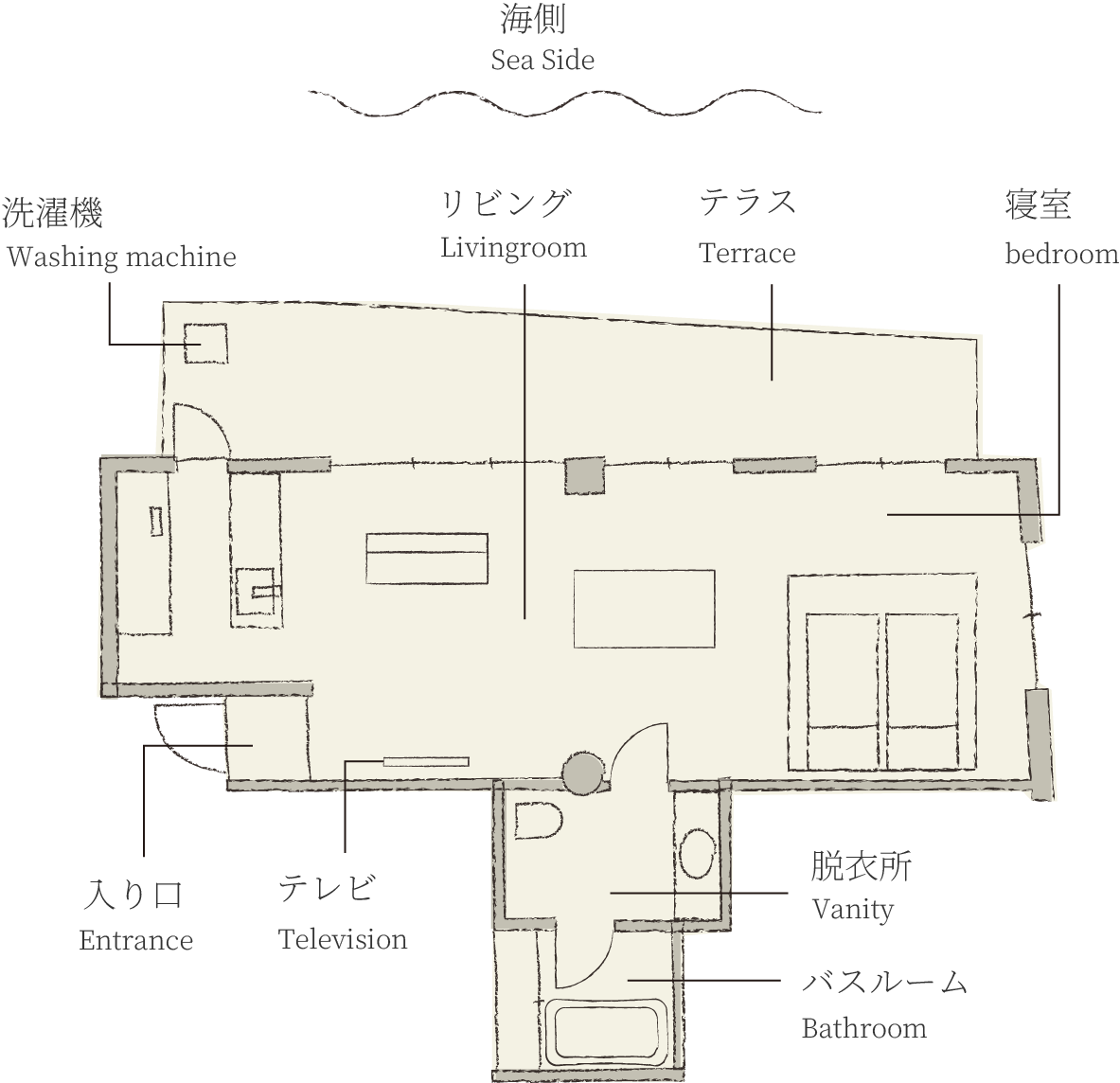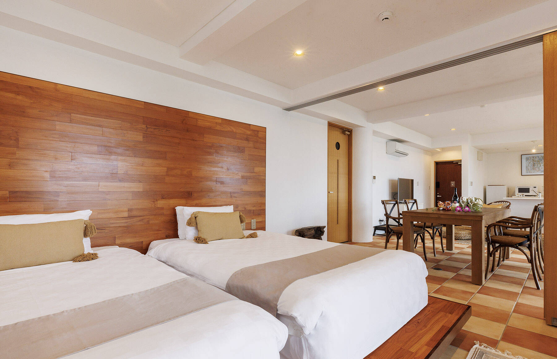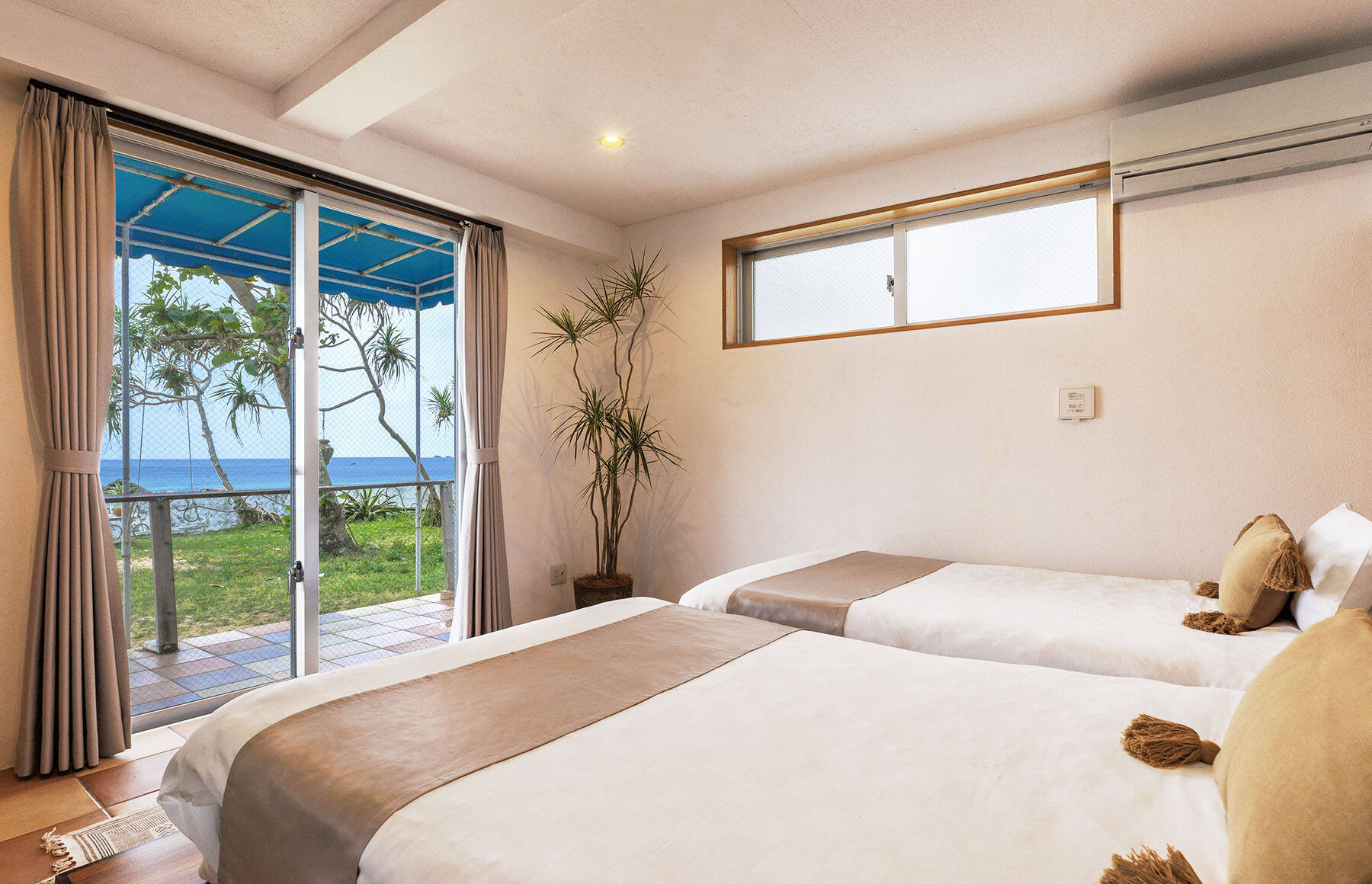 海に向かって間口が広く、ベッドルームからもビーチを眺めることができるお部屋。
