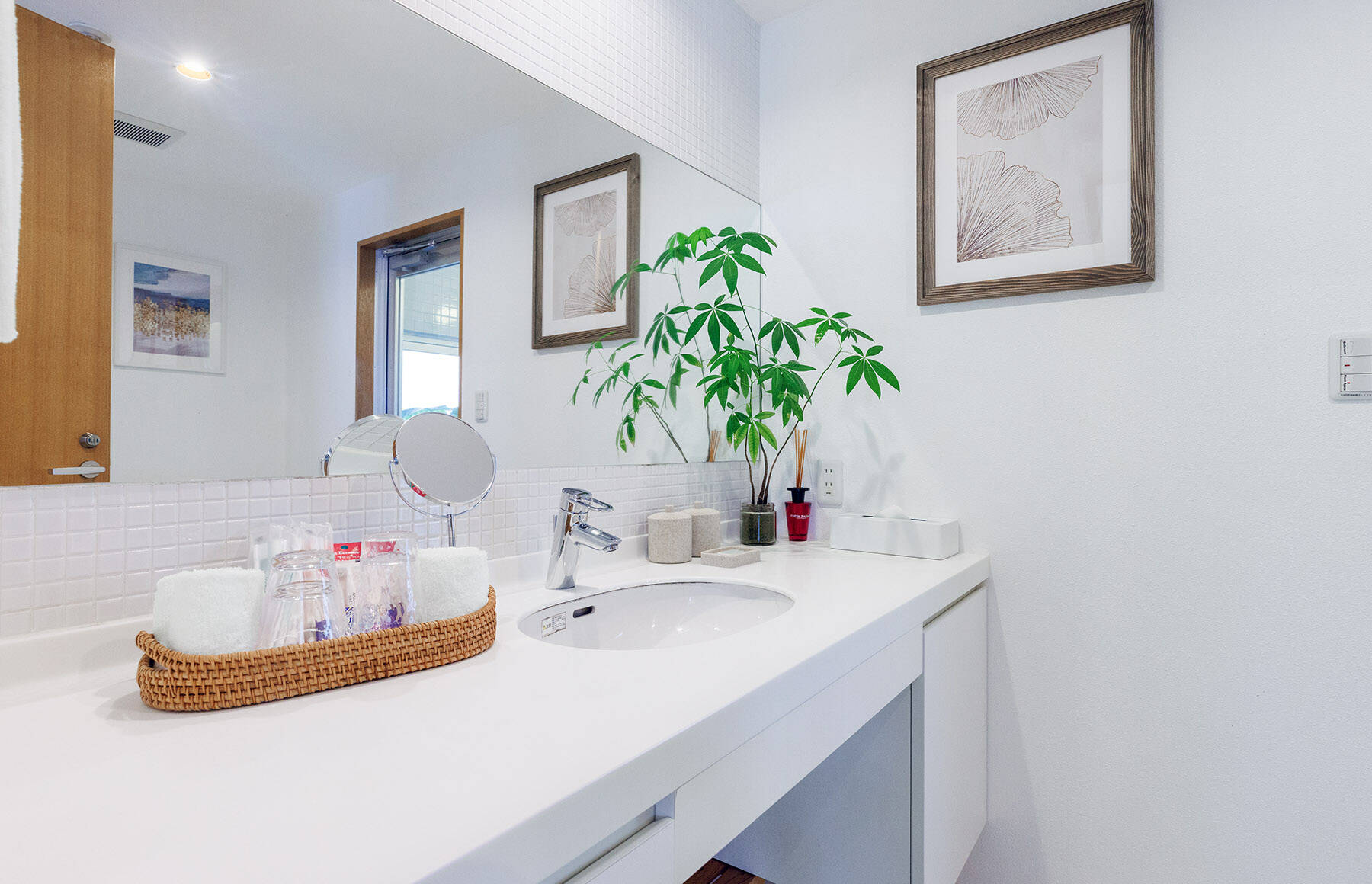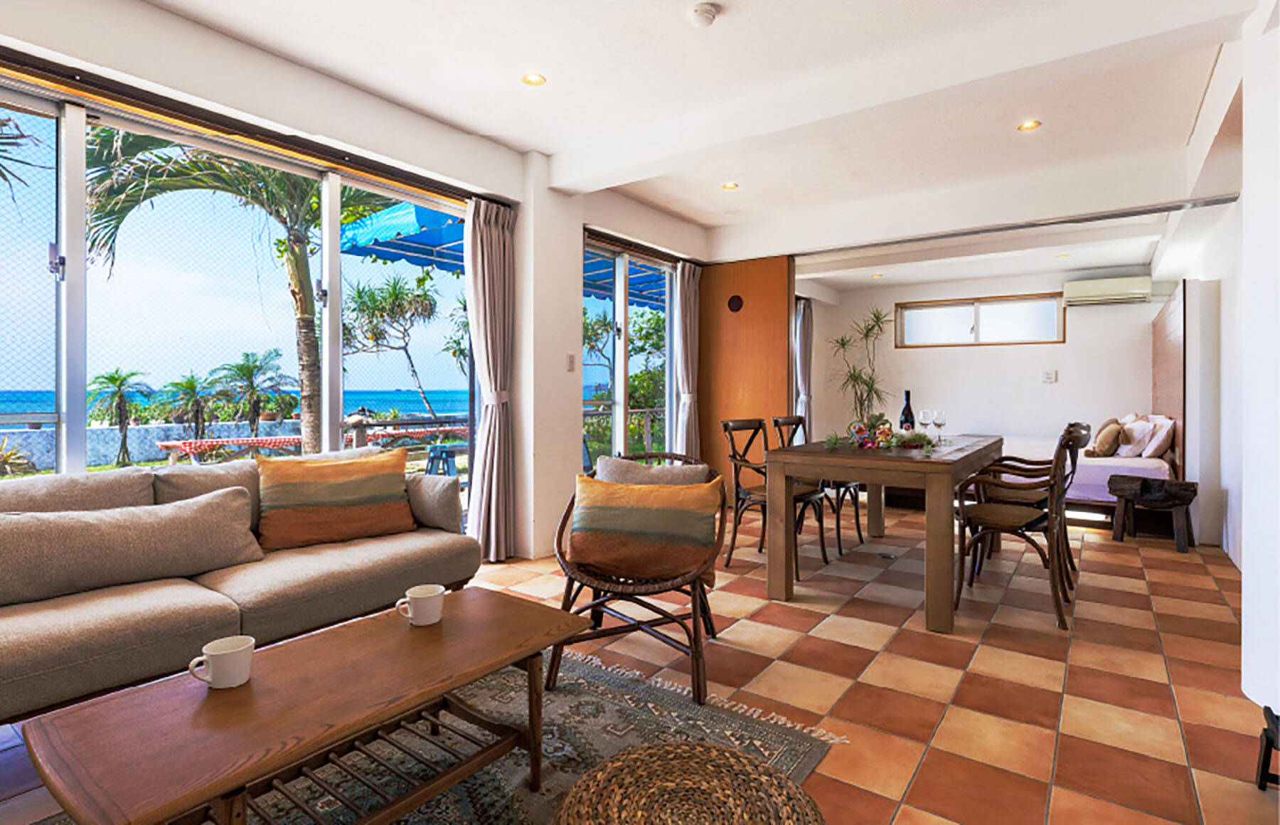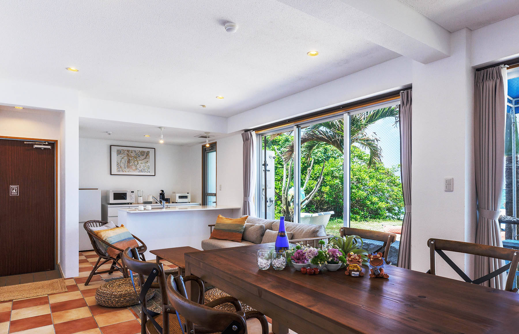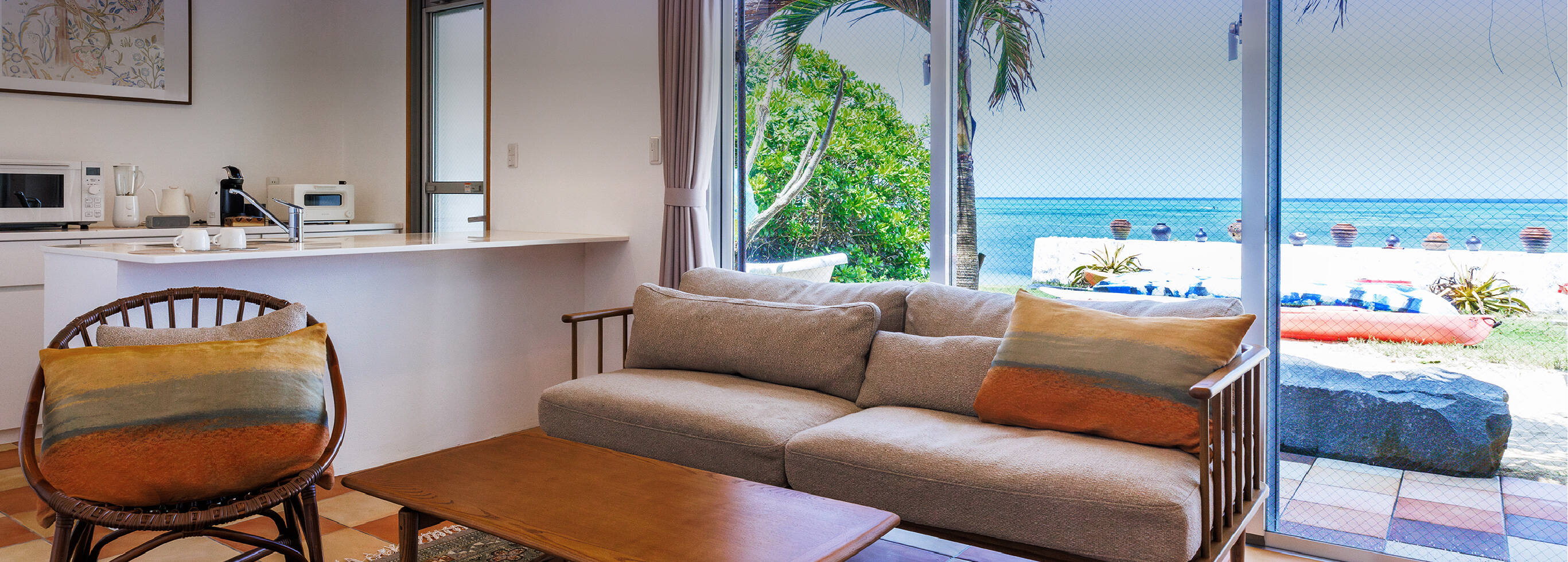 海に向かって間口が広く、ベッドルームからもビーチを眺めることができるお部屋。